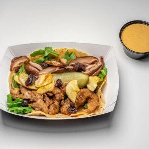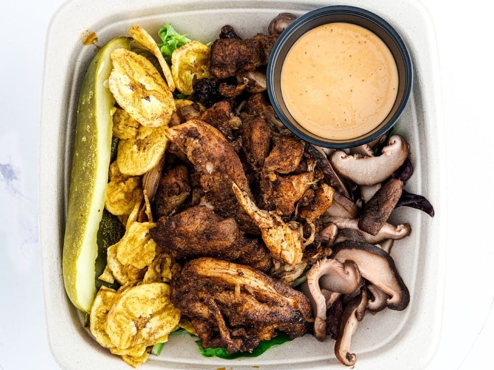 raisins, pickles, plantain chips, chipotle aioli